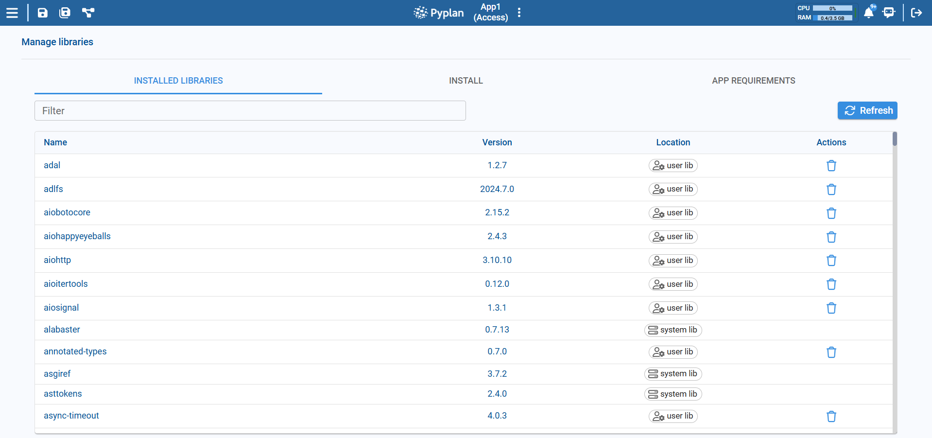 We manage an application’s Python libraries from Manage libraries, which contains three tabs: Installed libraries, Install, and App requirements.