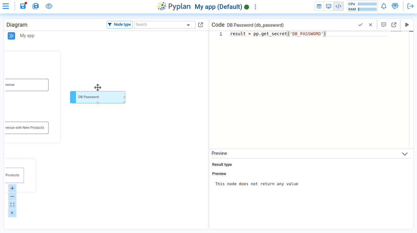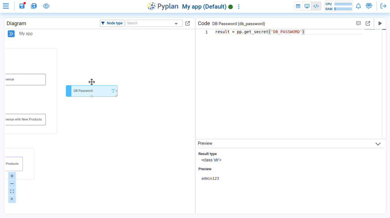 You can access this key in Pyplan by running result = pp.get_secret('DB_PASSWORD')inside a node: